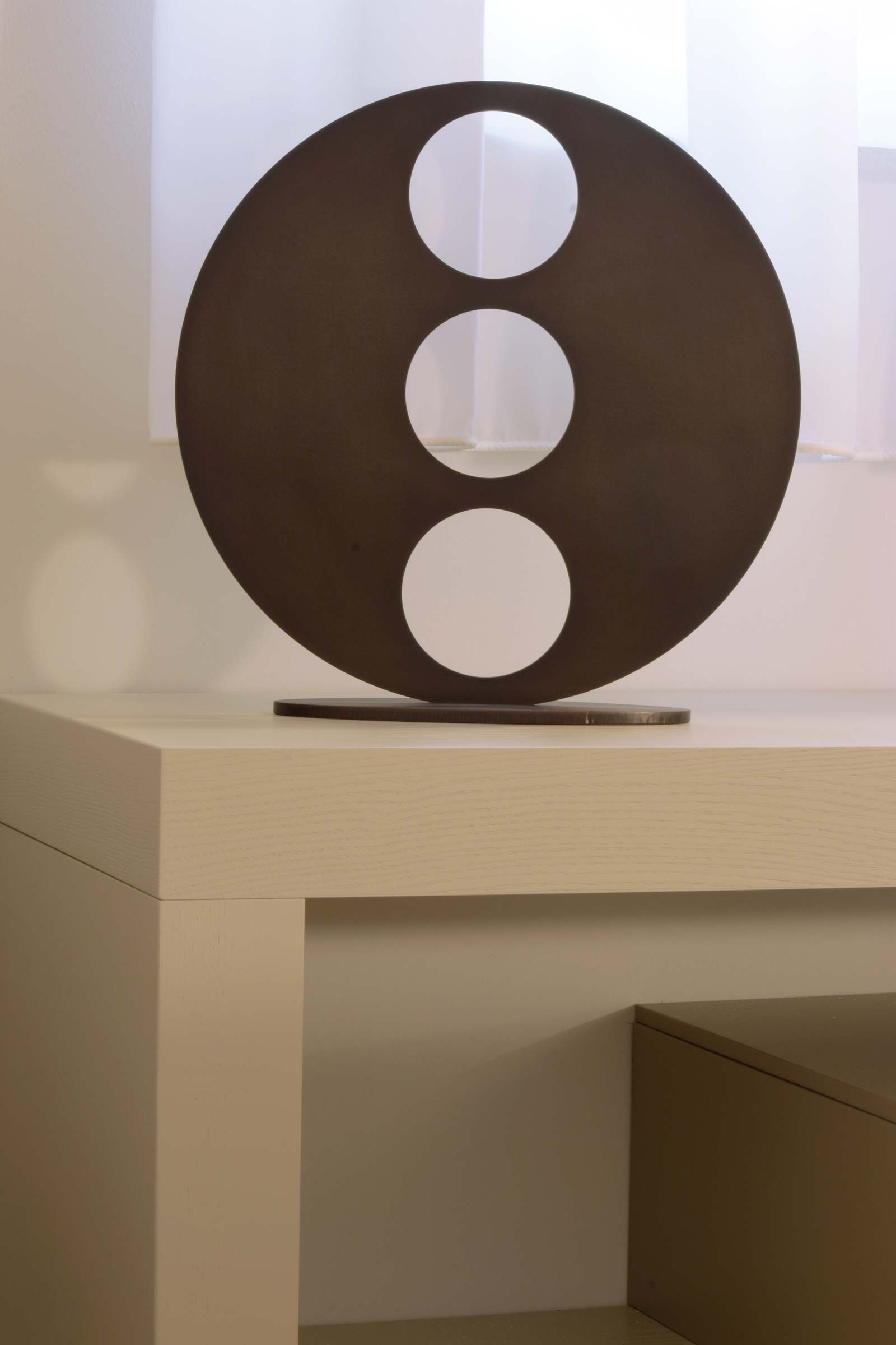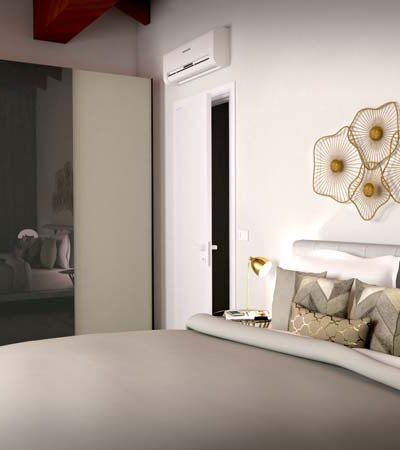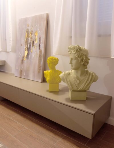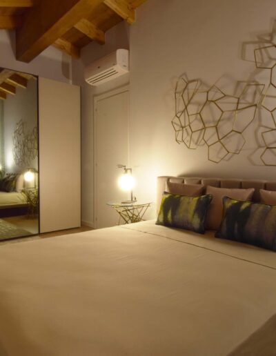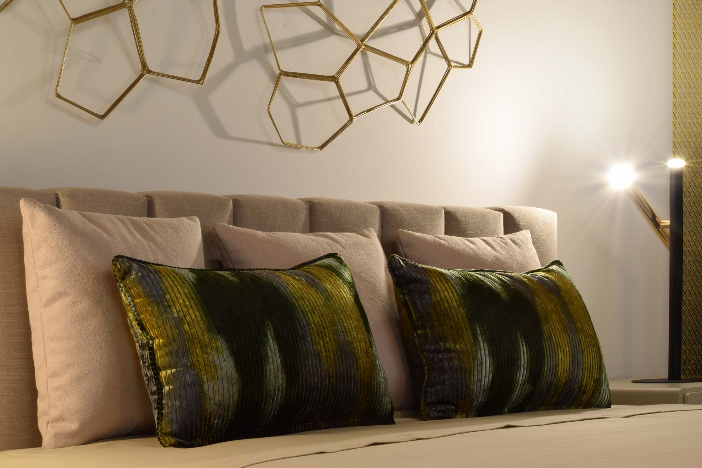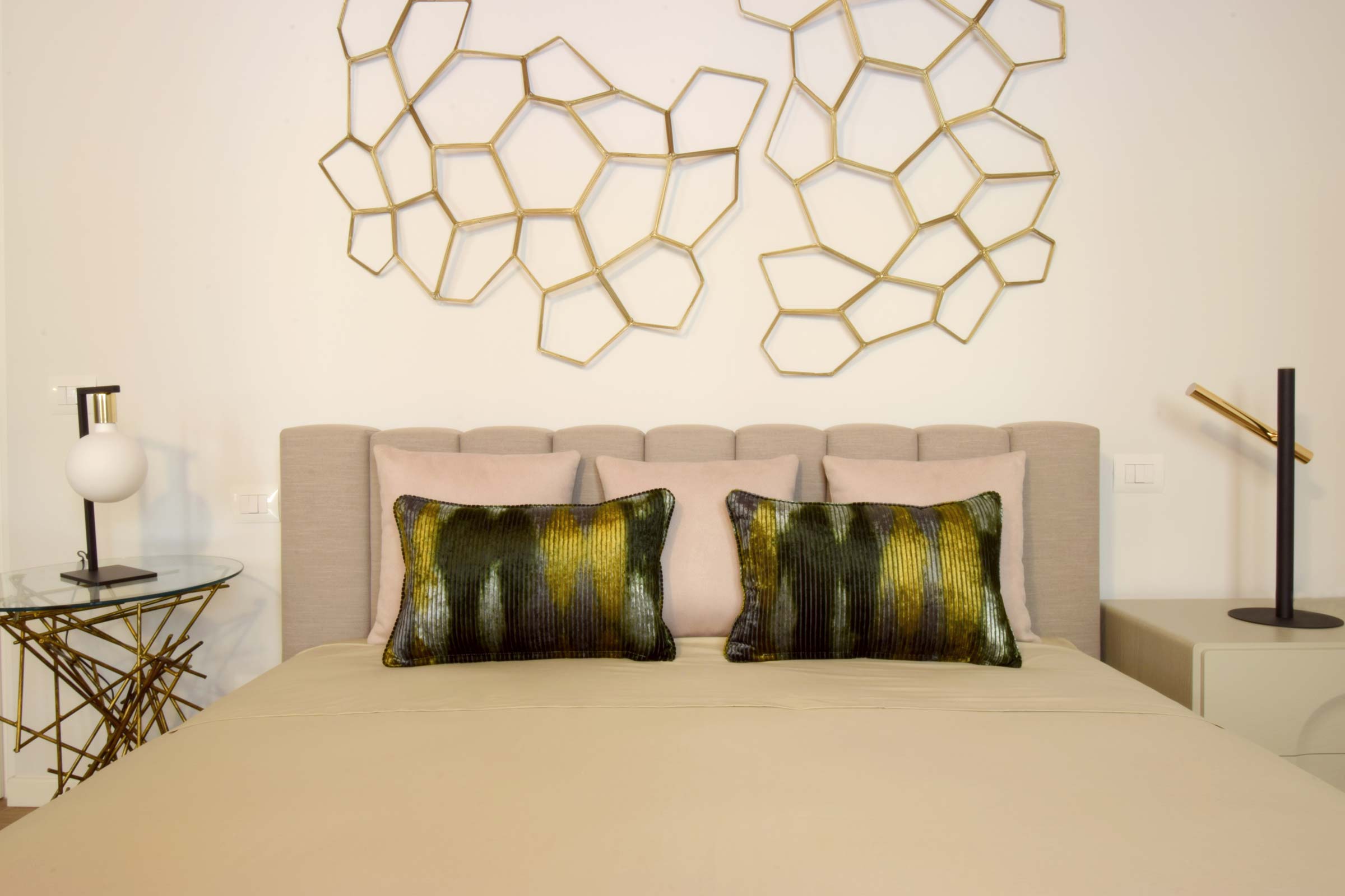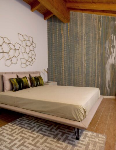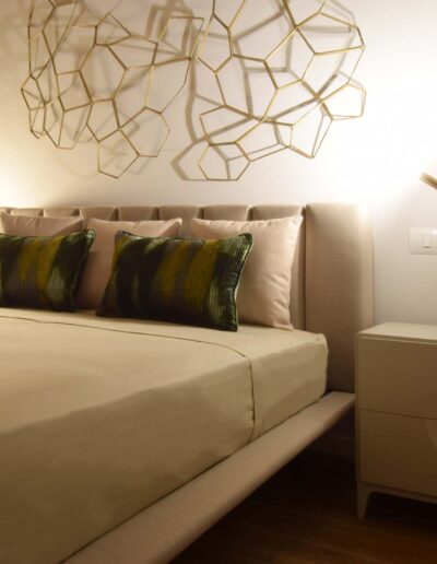 Il letto, dal design minimale e leggero, presenta una testata a fese, arricchita da un’elegante composizione di cuscinerie. Sopra il letto, una scultura in metallo dorato aggiunge un tocco di design, vestendo la parete con modernità e arte.