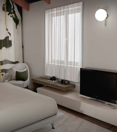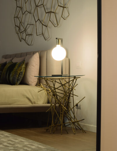 Ad incorniciare il letto, un tavolino scultura con un design audace che crea un punto focale unico ed un comodino a contrasto dalle linee pulite e minimaliste che aggiunge un ulteriore tocco di contemporaneità.