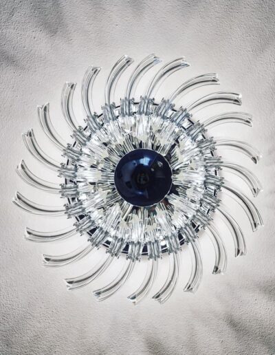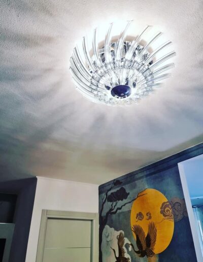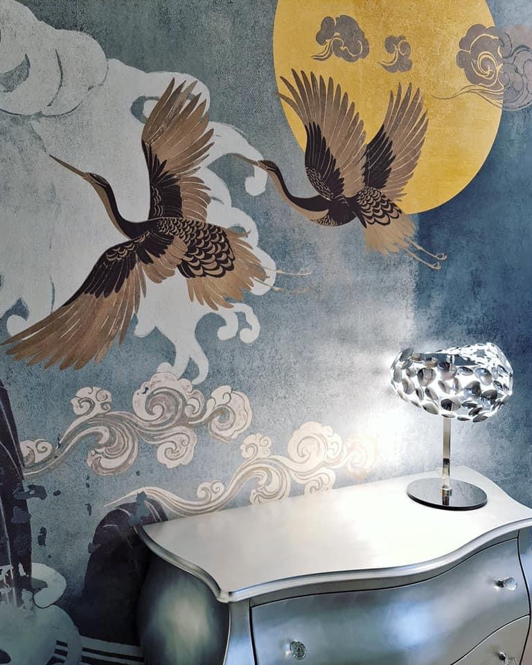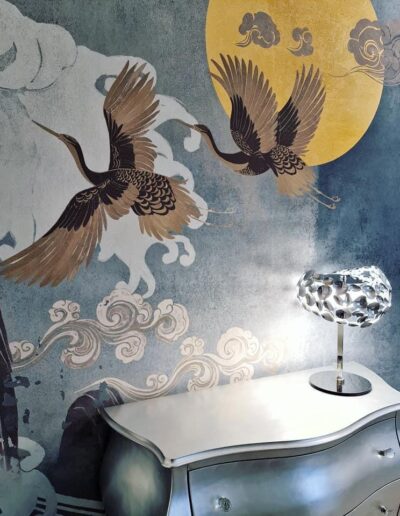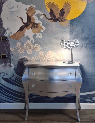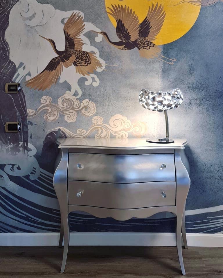 Per noi, rivalorizzare gli spazi è una vera e propria missione dettata dalla passione e dal cuore. Protagonista di questo Home Makeover è una splendida tappezzeria d’ispirazione orientale, che vede risplendere una dorata e soffusa luna volta nel profondo e voluttuoso blu del cielo. Dai qui tutti gli elementi si fondono e abbracciano in maniera sapiente e armoniosa; l’elegante cassettone realizzato a mano e rifinito in foglia argento, che prende ispirazione dalle livree argentee della luce lunare, come la lampada dal design “marziano” realizzata in cristallo e in acciaio finitura cromata che riproduce una soffusa e ancestrale luce d’atmosfera. Altro grande protagonista è uno splendido tappeto realizzato in preziosa cangiante viscosa, che riproduce la perfetta siluette del satellite lunare. A completare il tutto un’importante poltrona dal gusto barocco realizzata su richiesta della committenza, realizzata in vera foglia argento e rivestita in sontuoso velluto operato color zaffiro. Elemento di chiusura il varco a giorno che riproduce la sagoma di un albero, ripresa nella carta da parati.