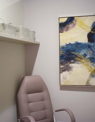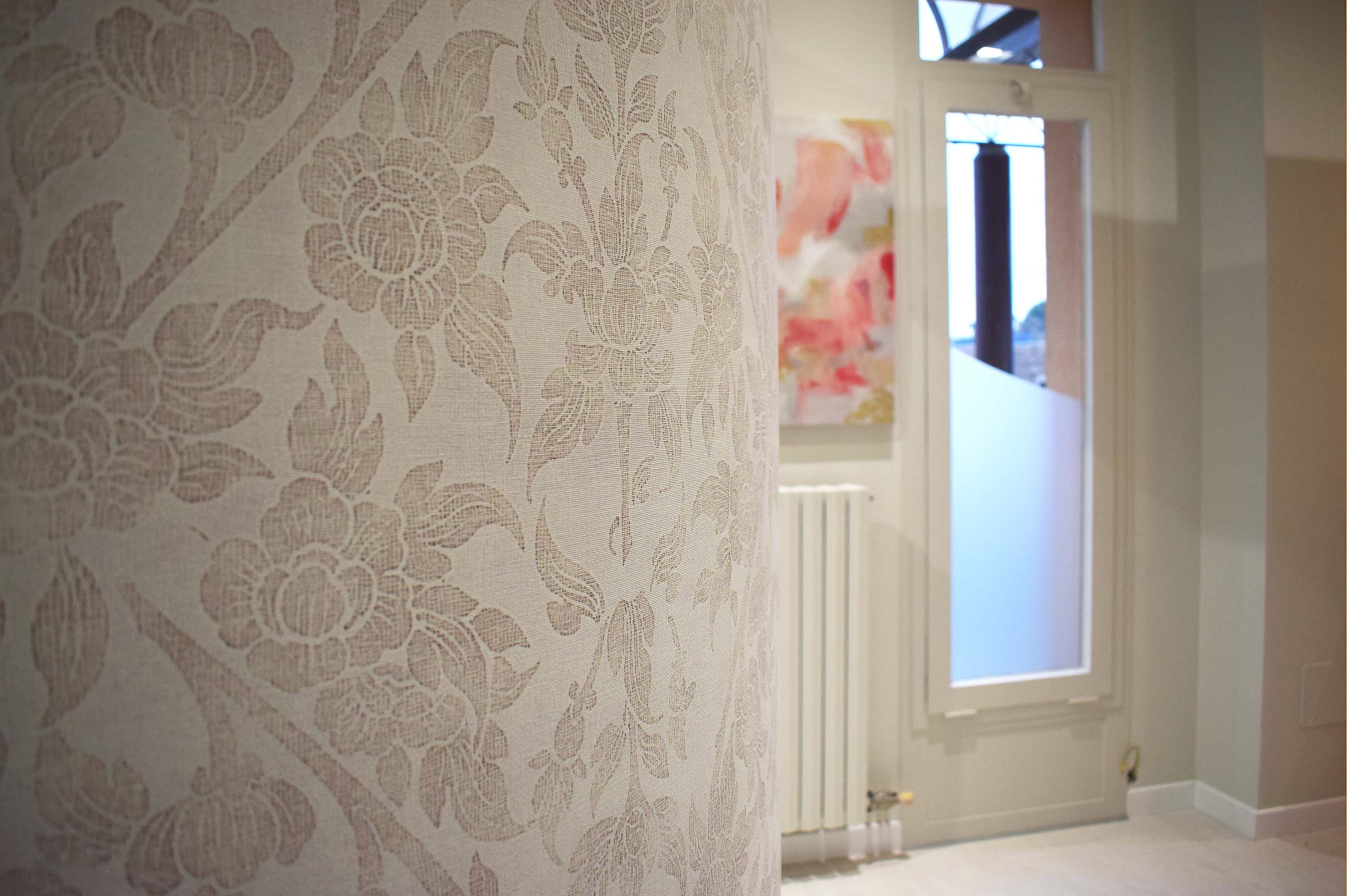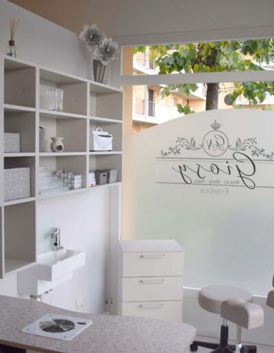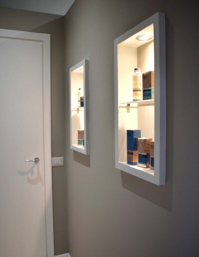 I giochi di contrasto creati grazie all’ausilio di tenui cromie tono su tono, vanno a valorizzare tutte le strutture che delimitano i box lavoro, realizzate in cartongesso e caratterizzate da ariose stondature, punto forte del nostro progetto. Un pavimento venato corre per tutto il negozio e si sposa perfettamente con la palette colori da noi immaginata e con la splendida carta da parati damascata che valorizza in maniera squisita la sala di aspetto del locale. E qui, una danza di rosa cipria e di grigi scelti con cura per le poltroncine a bocciolo rivestite in velluto, a contrasto con un delizioso divanetto a contrasto dal sapore ricercato, uno splendido tappeto con disegno floreale, che si abbraccia con le spatolature di una importante specchiera in foglia argento, delineano e imprimono l’immagine di tutto il negozio: FORTE ed ELEGANTE come il quadro raffigurante un delicato volto femminile, che troneggia in fronte al bancone reception progettato anch’esso interamente su misura per garantire la massima funzionalità. Tre grandi teche sospese realizzate in cristallo, fungono da vetrina per i prodotti in vendita, integrate dalle rappresentative nicchie illuminate poste nei due corridoi laterali. Il Centro Estetico, immaginato per offrire alla propria clientela molteplici tipologie di trattamento, è stato così progettato e suddiviso; 5 diverse aree Box, rispettivamente dedicate a trattamenti differenti. Una dedicata alla ricostruzione Unghie e a tutti i trattamenti connessi, dove abbiamo realizzato su misura una struttura contenitiva sospesa capace di contenere tutti i prodotti necessari ad effettuare i trattamenti. Una dedicata ai trattamenti Corpo, dotata di doccia integrata utile a sopporto dei trattamenti Body e caratterizzata da luci per cromoterapia. Un’area dedicata ai trattamenti ciglia ed un altro box jolly multitrattamento. Per concludere l’immancabile Box dedicato alla lampada viso trifacciale. Ogni Box è caratterizzato da opere astratte scelte con cura per creare un’atmosfera rilassata e distesa. Tutte le strutture contenitive presenti sono realizzate interamente su misura in tinta muri. Un progetto che noi di Casaidea s.n.c. Architettura-Arredamento-Antiquariato abbiamo creato e seguito in ogni dettaglio e con estrema dedizione, che vede dare vita a un centro estetico che ha tutte le carte in regola per diventare un punto di riferimento sul territorio.