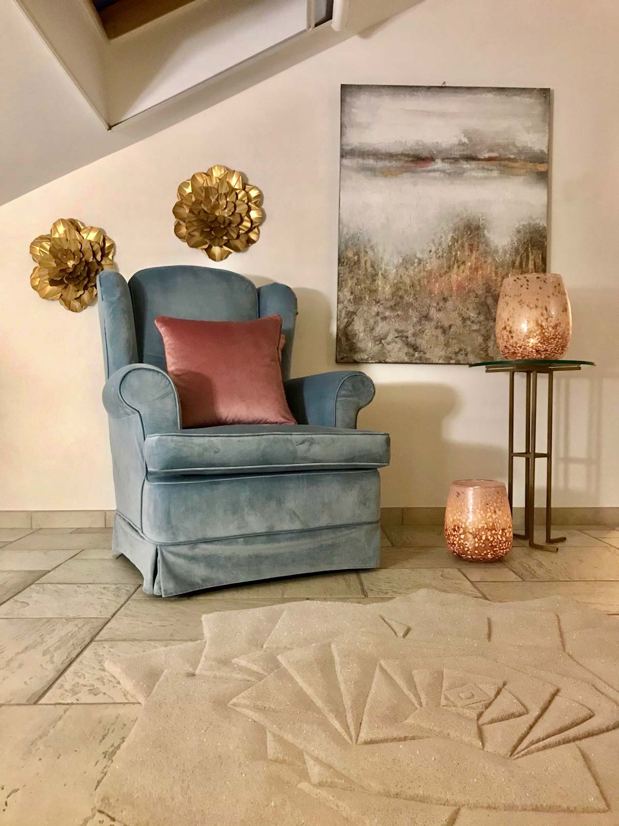 Al centro di questo luogo incantato trova spazio un elegante tappeto scultura di design a forma di rosa, un omaggio alla delicatezza della padrona di casa.