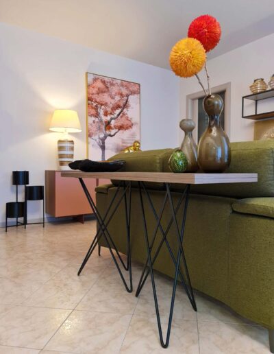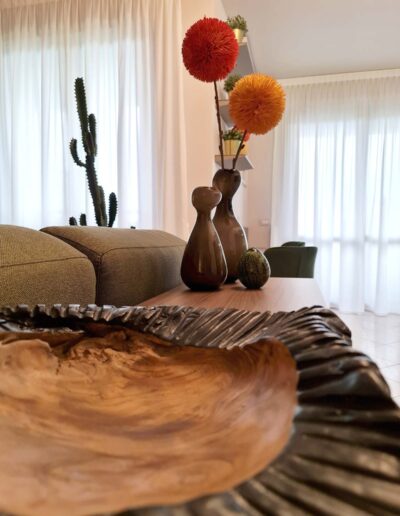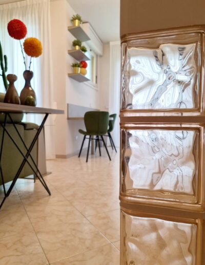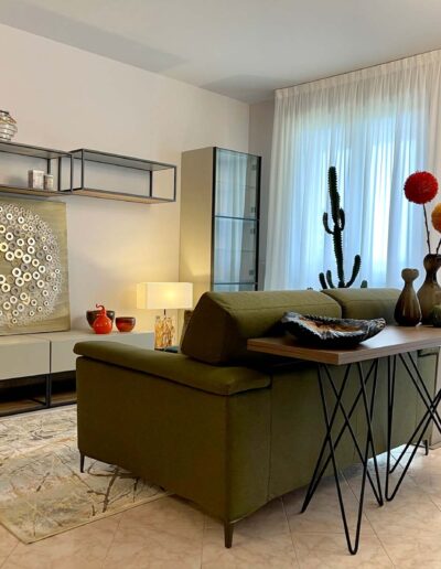 La zona living prosegue armoniosamente nel delineare un ambiente soggiorno estroso e ricco di dettagli e particolari: la parete televisione volutamente sobria e minimale, caratterizzata da dettagli e intelaiature in alluminio brunito, diviene il contenitore perfetto per il variopinto mondo del committente; gli elementi a giorno e il totem a vetrina lasciano carta bianca alle sue inclinazioni personali, lasciando la possibilità di completare i vuoti della composizione con oggettistica di qualsiasi forma e stile.
