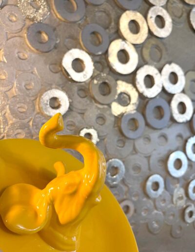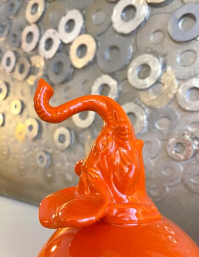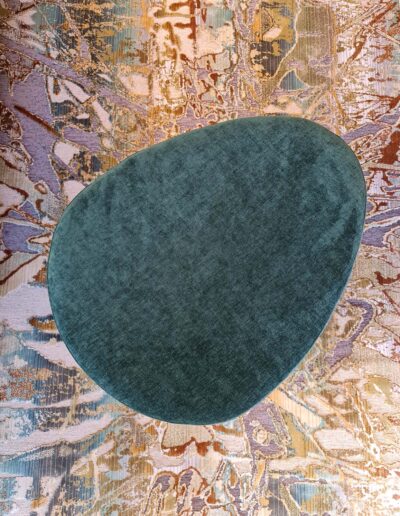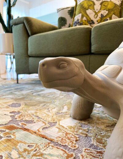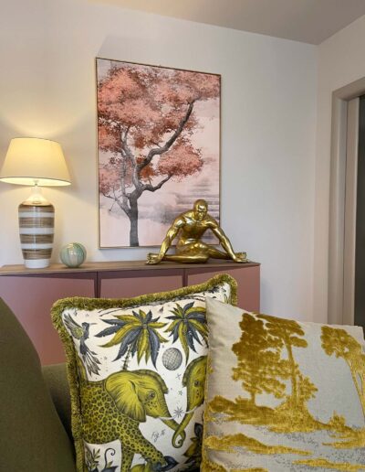 I pezzi di arredo a contrasto, quali la libreria turtle e il maestoso pensatore in foglia oro posizionato su una maxi madia color rosa marsala, estremizzano volutamente la volontà di realizzare una casa nella quale gli opposti divengono trait d’union per esprimere al meglio le molteplici sfaccettature ed inclinazioni che caratterizzano il padrone di casa.
