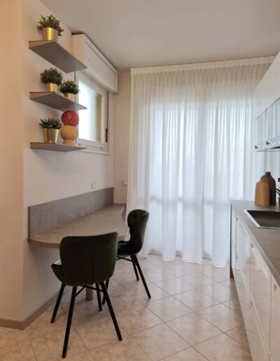 Un piano sagomato e disegnato a progetto completa lo spazio cucina mantenendo leggerezza ed ergonomia, fornendo un comodo spazio ove pranzare e cenare comodamente.