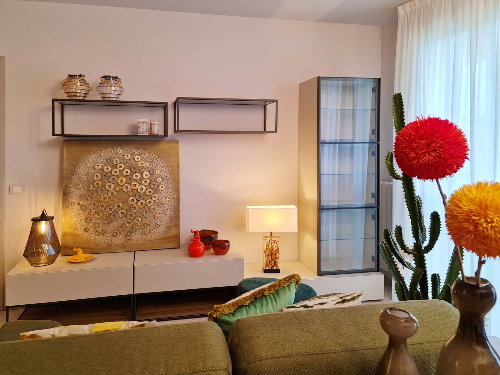 Prendi un giovane ricco di passioni e interessi ed un appartamento con un ampio e luminoso soggiorno da trasformare in un vivace contenitore di oggetti ed idee! Unisci il tutto alla sua necessità di esprimere se stesso e la sua colorata fantasia: ed ecco nascere uno spazio vivace e pieno di energia, dove spiritualità e materia convivono armoniosamente.
