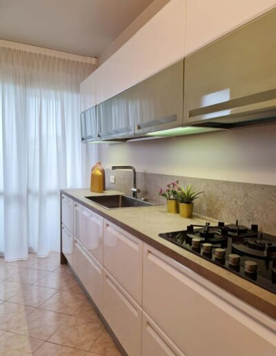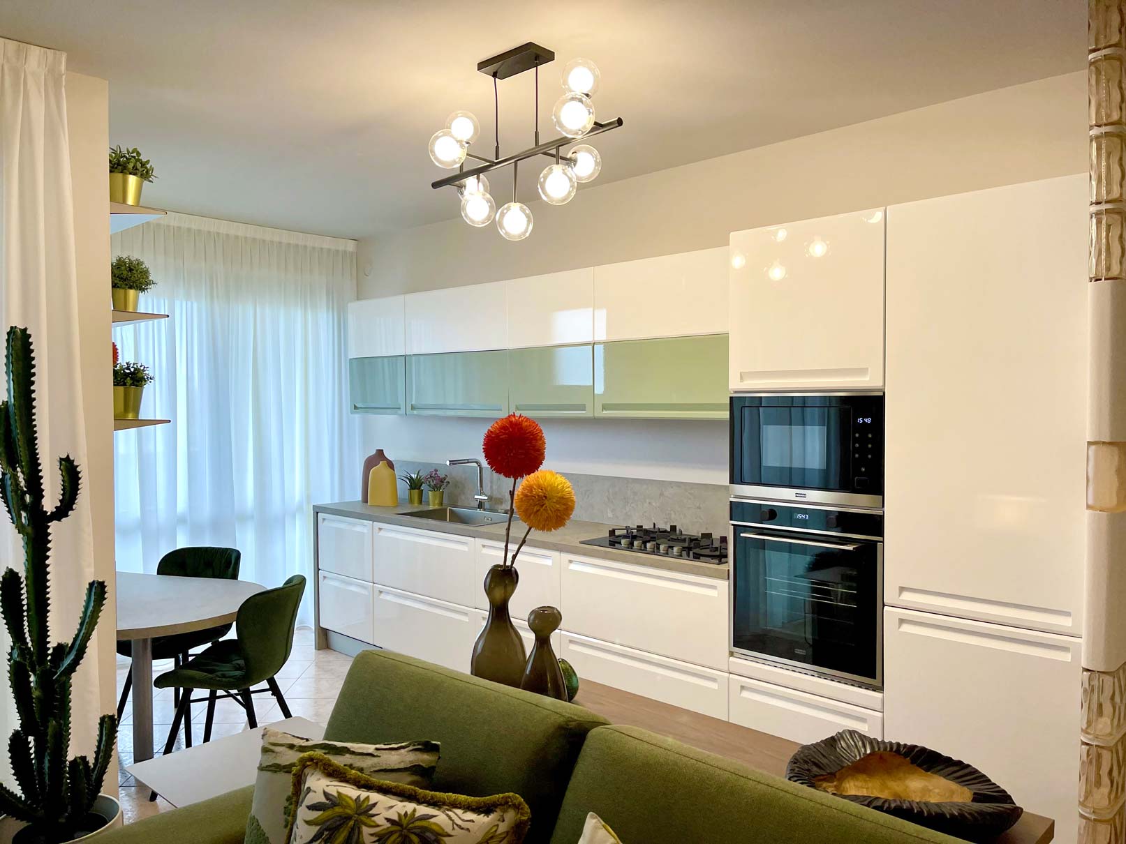 Una spaziosa cucina, dotata di un generoso piano cottura, permette al padrone di casa di esprimere la sua passione per l’arte culinaria dopo una lunga giornata di lavoro con sottofondo la sua musica preferita capace di animare l’intero open space. La composizione lineare, leggera e contemporanea è movimentata e resa giovane dalla presenza delle ante a contrasto, proposte in una fresca tonalità di verde. Il finish lucido rende il tutto ancora più glam e luminoso.