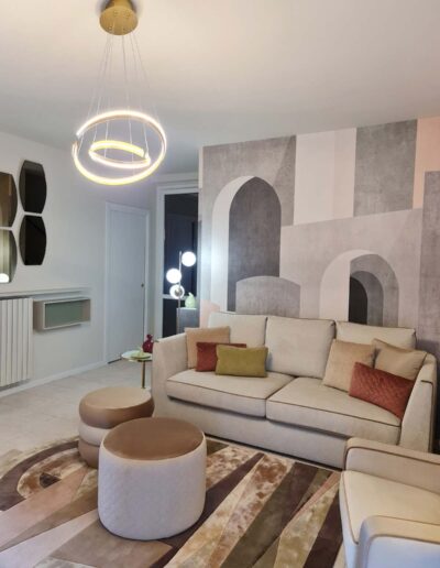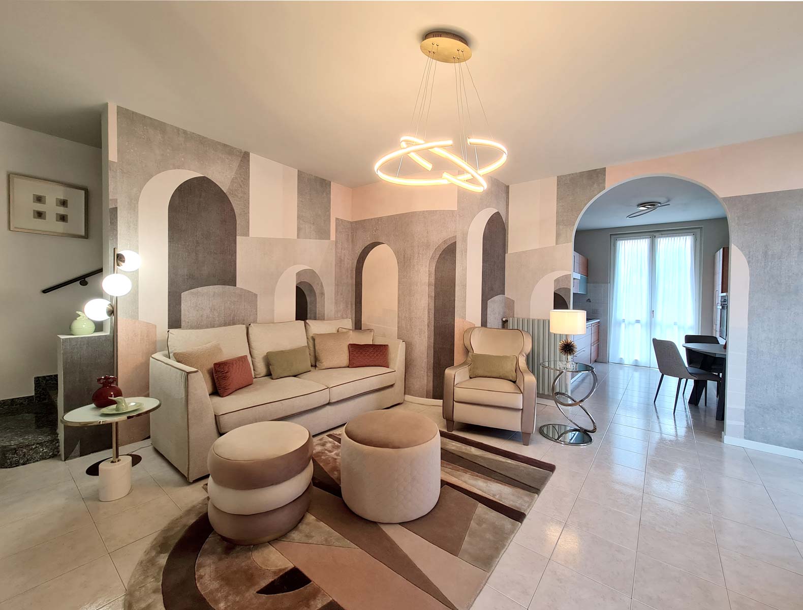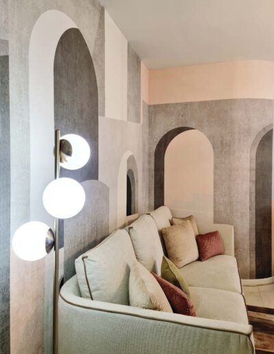 Il tema principe e di ispirazione dell’intera trasformazione è rappresentato da una meravigliosa carta da parati di gusto architettonico, un trompe-l’oeil moderno ove ogni portale sembra portare ad un ambiente nuovo, sino a fondersi completamente con quello di accesso alla zona cucina.
