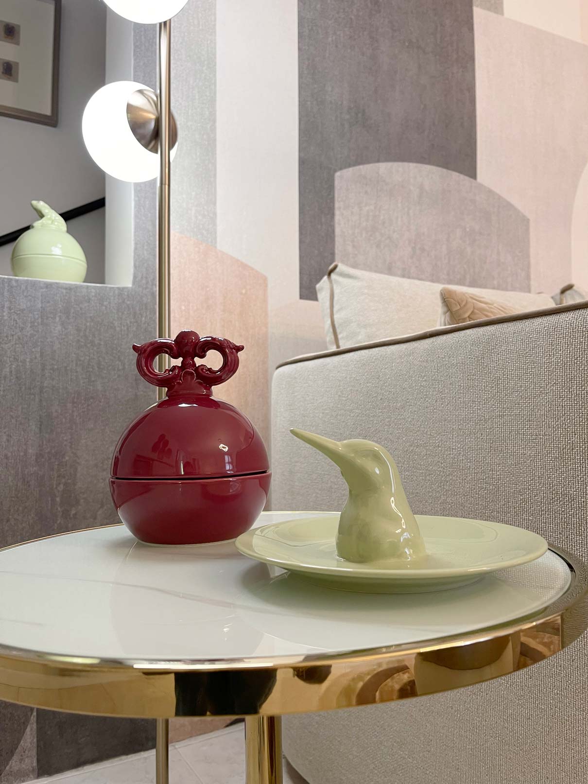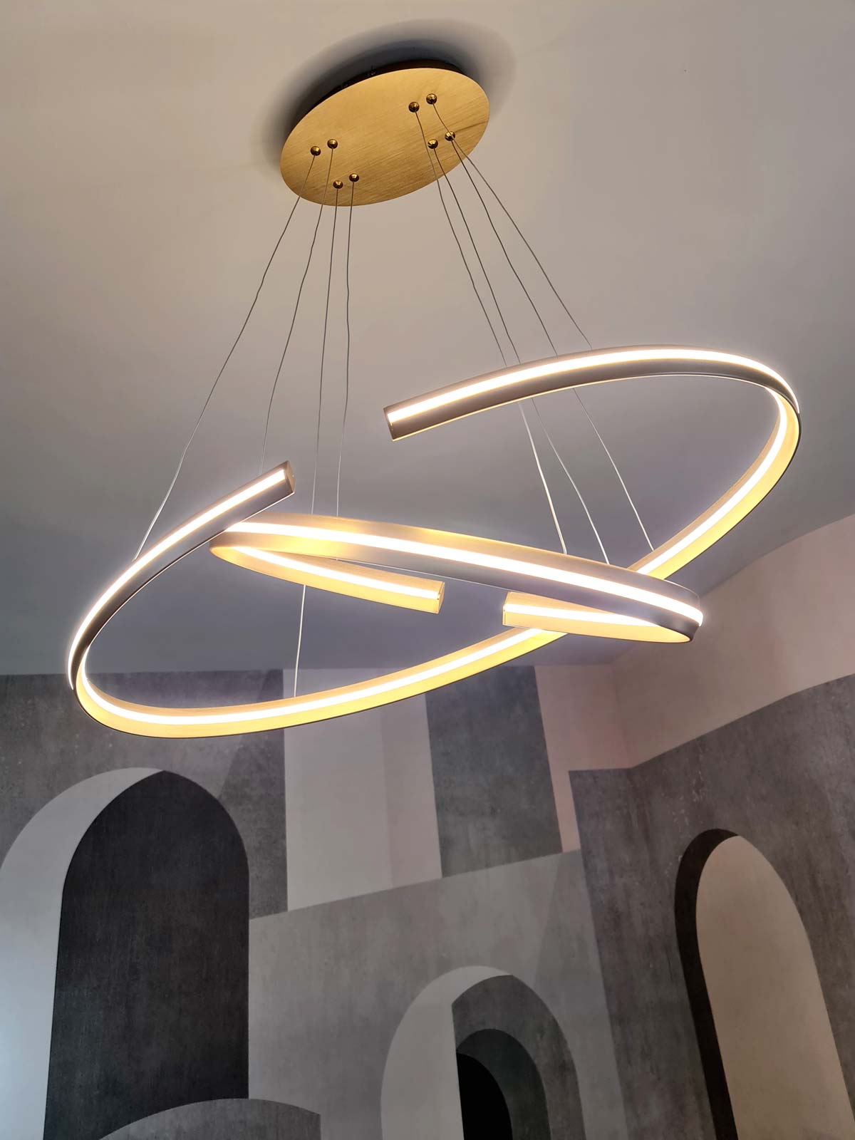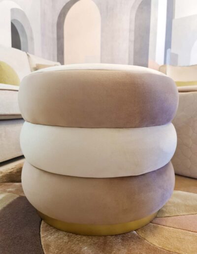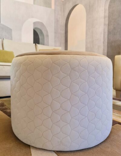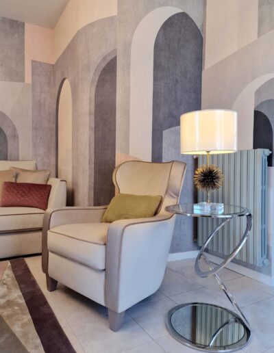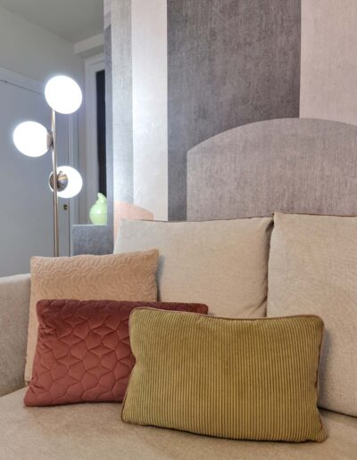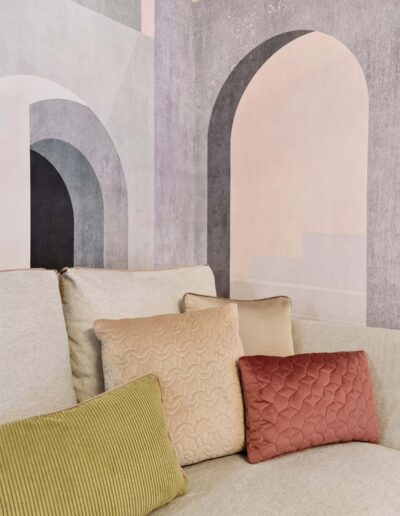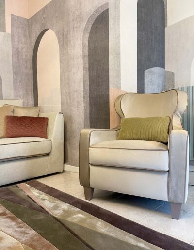Tutto è rigorosamente confezionato ad hoc per questa dimora: gli imbottiti, come il divano di nostro disegno, realizzati a mano artigianalmente, accentuano ed abbracciano le sinuosità suggerite dalla parete curva di sfondo e l’arco che la affianca; gli splendidi tessuti Made in Italy e i materiali scelti con cura regalano sensazioni tattili uniche, magicamente intrecciati ed accostati in questa realizzazione estremamente armoniosa e soffusa.