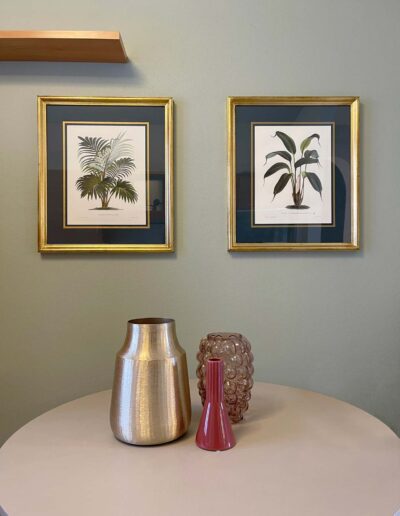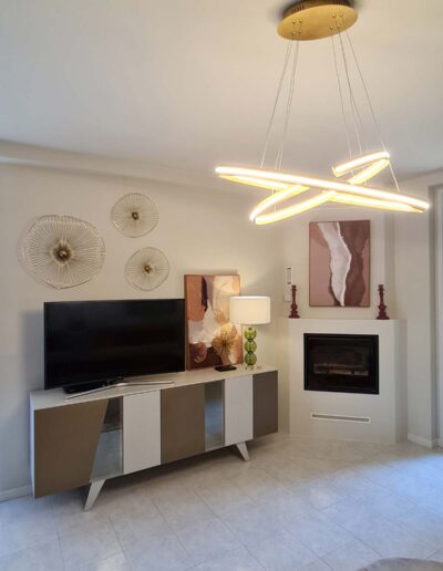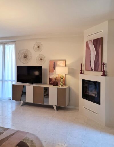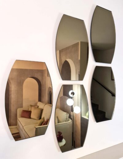 Ogni parete acquisisce la propria identità attraverso la scelta degli arredi: a completare la zona salotto, che rappresenta lo scorcio su cui si apre l’ingresso, troviamo una maxi madia realizzata su misura impreziosita dalle livree dorate e laccature delle ante, che comunica soavemente con il volume del camino, riprogettato per alleggerire lo spazio, ed una zona svuota tasche leggera ma di grande effetto. Una composizione di specchi di design completa il tutto, regalando un suggestivo riflesso di tutta la stanza.