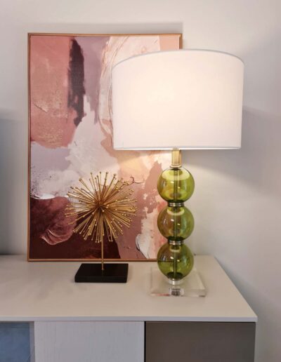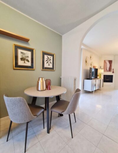 I tocchi di verde aggiungono una nota frizzante e dinamica e si legano alla trasformazione della zona soggiorno espandendosi in quella della cucina, rinfrescata grazie ad un angolo pranzo completamente trasformato. Il nuovo tavolo rotondo completato da delle nuove sedute vuole essere un ulteriore richiamo al tema della sinuosità della curva, che caratterizza ed enfatizza il tema architettonico del contesto.