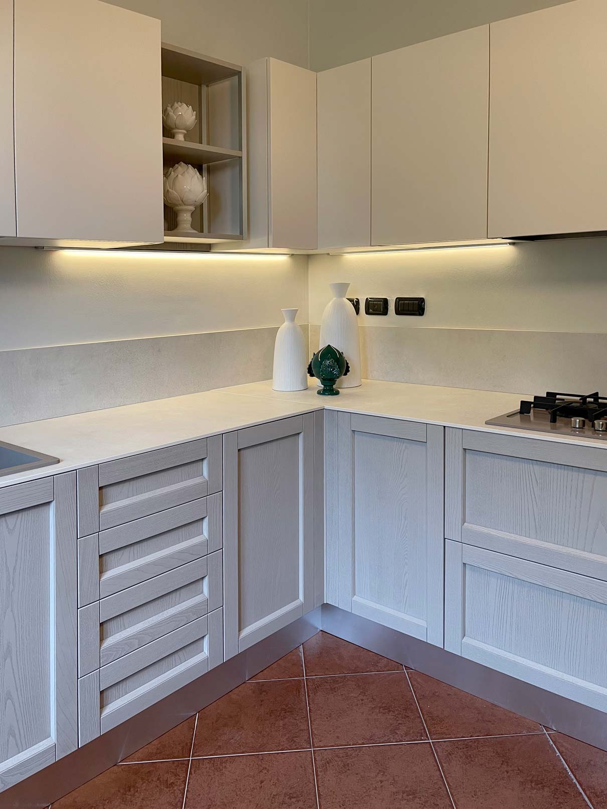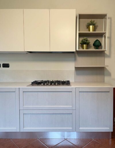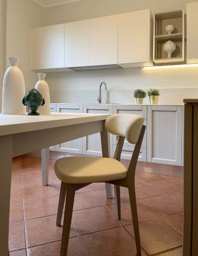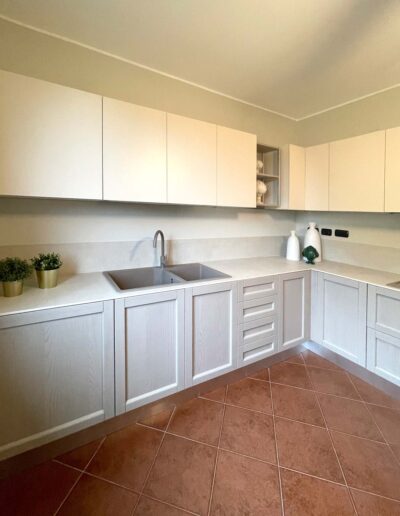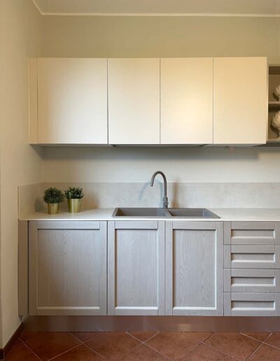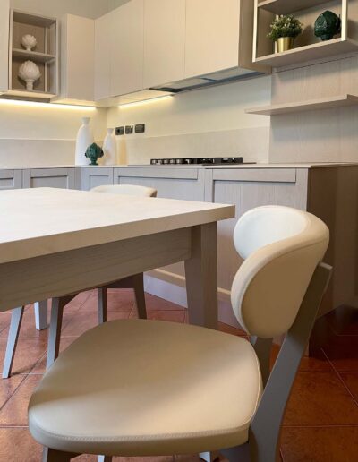 Siamo all’interno di una splendida Villa degli anni 60′, situata al confine della città di Lodi, circondati da un lussureggiante e curatissimo giardino. I proprietari, una giovane coppia, ci contattano per la realizzazione della loro cucina. Eseguito il sopralluogo e raccolte tutte le informazioni, eccoci per discutere della nostra realizzazione. L’ampia cucina ad angolo che vedrà la luce avrà un carattere e un’impronta dal sapore tradizionale aderente al contesto abitativo, caratterizzato da una vecchia ceramica effetto cotto e da dettagli rustici. Per movimentare il tutto consigliamo ai ragazzi, di mixare elementi anche più contemporanei, in modo da non ottenere un effetto statico. Alla elegante anta a telaio in legno massello utilizzata per le basi, accostiamo così elementi moderni come il Top in Gres effetto pietra, i pensili rifiniti in Vera Laccatura e i pensili a giorno con telaio in alluminio. Elettrodomestici in alta classe di risparmio energetico e pratici per l’utilizzo quotidiano, insieme a tavolo e comode sedie a poltroncina rivestite in ecopelle, completano la composizione. Per un risultato che profuma di modernità, tradizione e assoluta sobrietà.